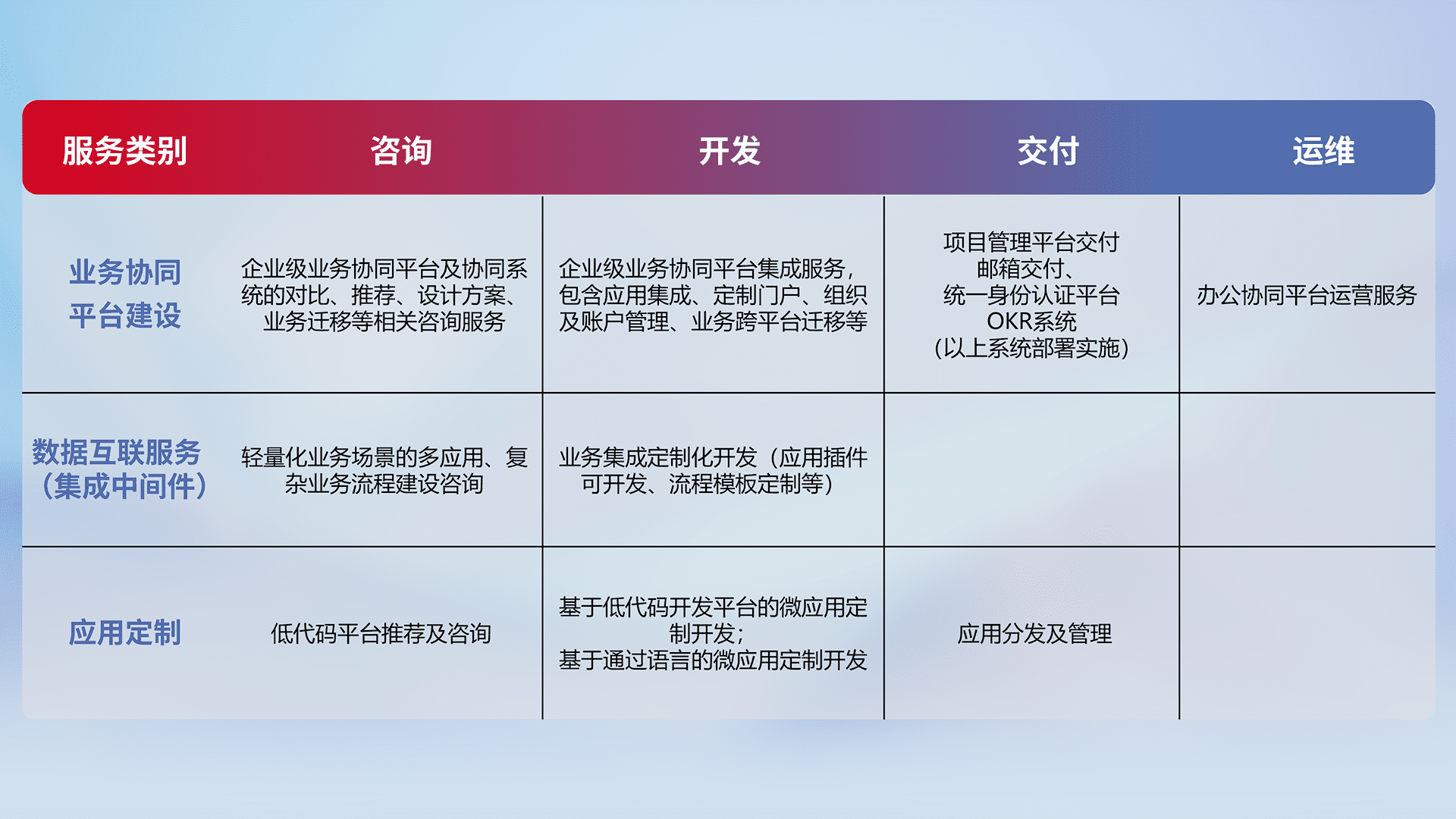 针对钉钉、、企微、、IDaas等平台级产品提供产品的规划、、方案、、、、交付、、、定制化开发等服务,,,实现如统一协同办公、、、、智能客户服务、、、混合会议管理、、智能数据查询、、等业务场景,,实现数字化转型。。。